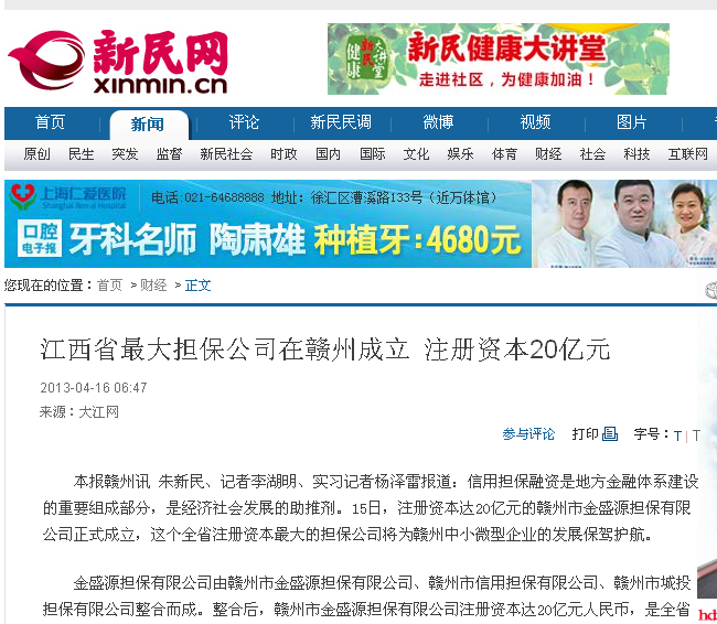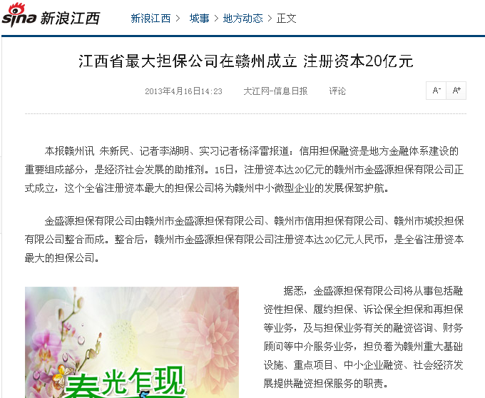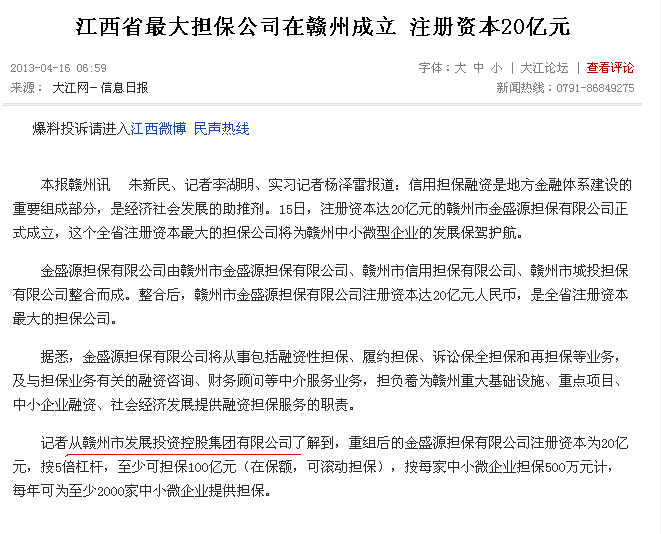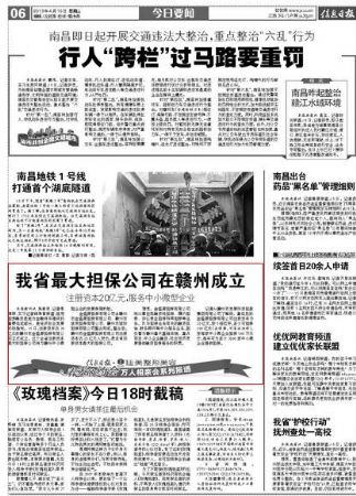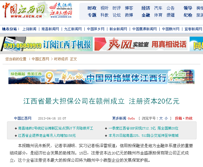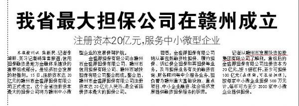 【信息日报】江西最大担保公司在赣州成立 注册资本20亿元