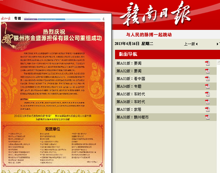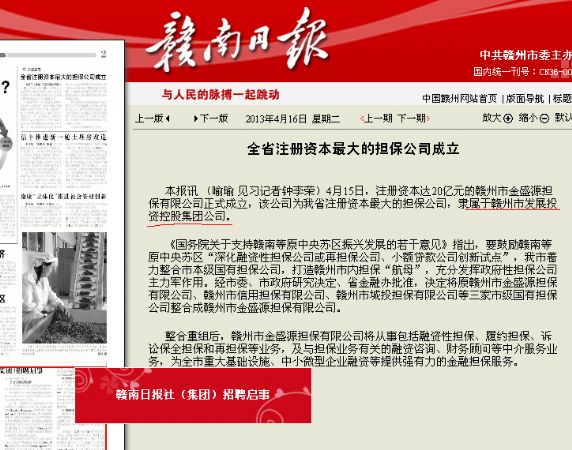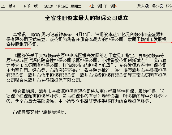 《国务院关于支持赣南等原中央苏区振兴发展的若干意见》指出,要鼓励赣南等原中央苏区“深化融资性担保公司或再担保公司、小额贷款公司创新试点”,我市着力整合市本级国有担保公司,打造赣州市内担保“航母”,充分发挥政府性担保公司主力军作用。经市委、市政府研究决定、省金融办批准,决定将原赣州市金盛源担保有限公司、赣州市信用担保有限公司、赣州市城投担保有限公司等三家市级国有担保公司整合成赣州市金盛源担保有限公司。
