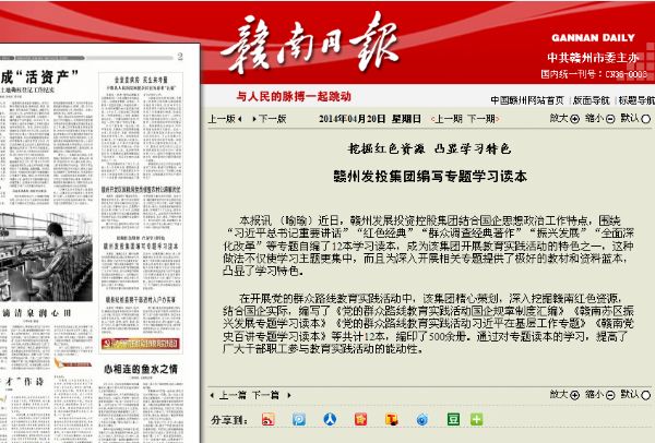 截止目前,公司对外报送群众路线新闻25篇,编发简报4期,更新宣传园地展板4块,在市级媒体刊发群众路线新闻1篇。值得一提的是,公司结合国企思想政治工作特点,围绕“习近平总书记重要讲话”“红色经典”“群众调查经典著作”“振兴发展”“全面深化改革”等专题自编了12本学习读本,为教育实践活动的深入、有效开展提供了极好的教材和资料蓝本。这一做法受到市委教育实践活动第33督导组的高度认可,4月20日《赣南日报》也对此进行了报道,成为集团公司开展教育实践活动的特色之一。