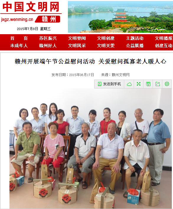 2015年6月17日,中国文明网图文刊发了《赣州开展端午节公益慰问活动 关爱慰问孤寡老人暖人心》新闻,报道必赢3003no1线路检测中心开展端午节公益慰问活动。