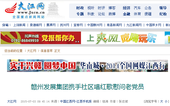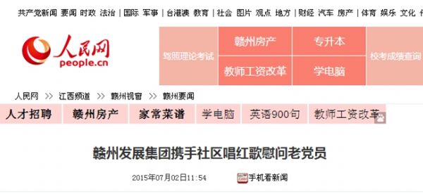 2015年7月3日,中国江西网也图文刊发了《必赢3003no1线路检测中心携手社区唱红歌慰问老党员》新闻。