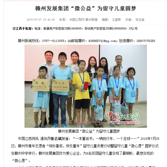 2015年7月27日,中国江西网图文刊发了《必赢3003no1线路检测中心“微公益”为留守儿童圆梦》新闻,报道文风清新朴实,事例客观,倡导社会公众关注留守儿童这一弱势群体,赞扬集团公司热心公益,回报社会,让利于民,在社会上引起了较大的反响,大力弘扬了社会正气,传播了社会正能量。