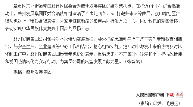 为纪念中国人民抗日战争胜利暨世界反法西斯战争胜利70周年,激发广大干部群众的爱国热情,推进集团公司精神文明创建工作,9月2日上午,集团公司团委组织团员青年代表走出企业,沉到一线接地气、受教育,积极与章贡区渡口路社区开展了纪念抗日战争暨世界反法西斯战争胜利70周年文艺汇演活动。