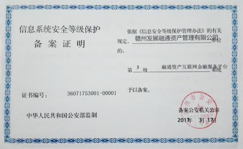 近日,集团旗下发展投资公司控股的融通资产公司信息系统正式通过了公安部国家信息安全三级等级保护备案,成为行业内少数获得此备案证明的互联网金融平台之一,标志着平台在合法合规发展的道路上又迈进了一大步。