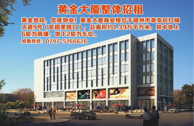 黄金大厦整体招租,黄金地段,优质物业!黄金大厦商业楼位于赣州市章贡区红旗大道9号(官园里路口),总面积约1.39万平方米,其中地上6层为商铺,地下2层为车位。
