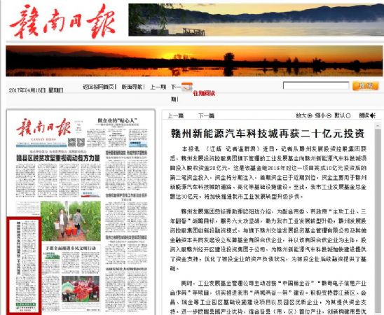 《赣南日报》:赣州新能源汽车科技城再获二十亿元投资