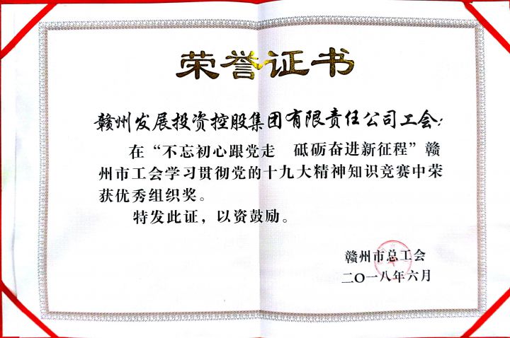 上一篇:集团荣获市国资系统“不忘初心 牢记使命”主题征文... 下一篇:集团工会荣获市总工会学习贯彻党的十九大精神“三等奖”