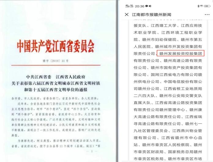近日,赣州发展投资控股集团被中共江西省委、省人民政府授予“第十五届江西省文明单位”荣誉称号,该集团连续蝉联三届“江西省文明单位”。