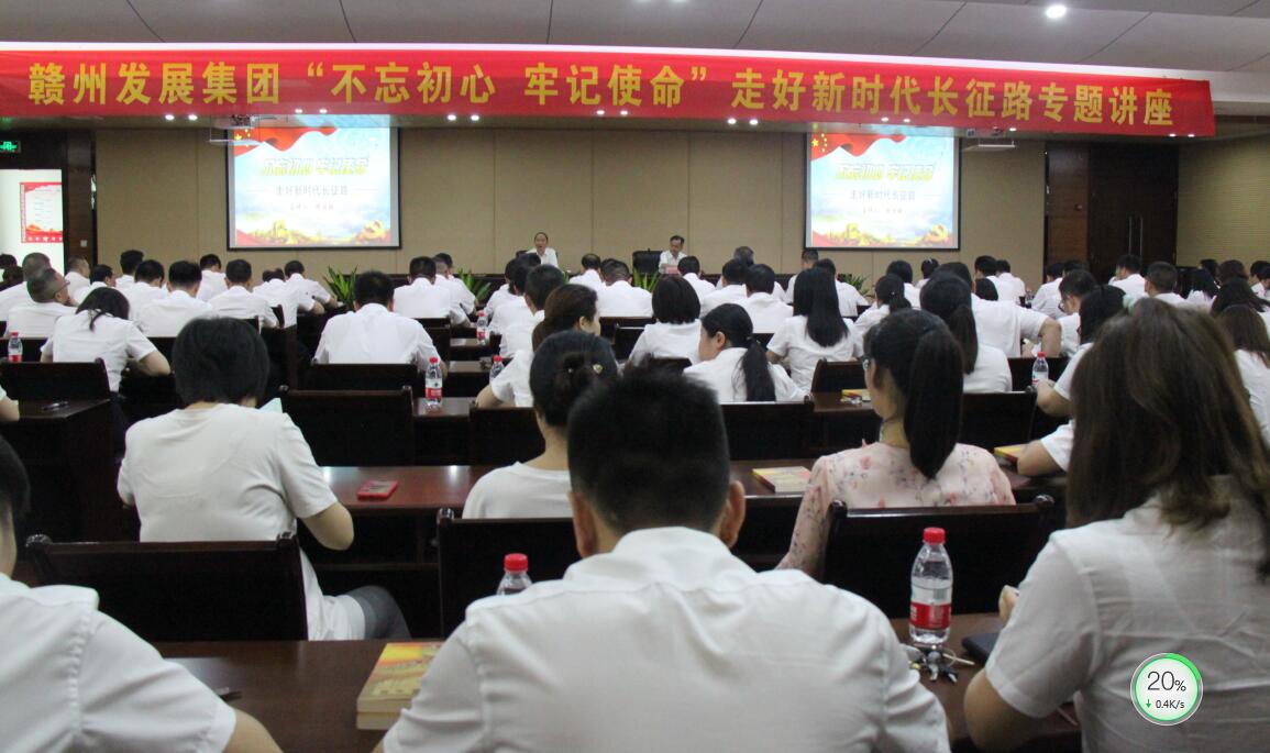 为迎接建党98周年,认真学习贯彻落实习近平总书记视察江西和赣州时的重要讲话精神,传承红色基因,走好新时代长征路,6月24日下午,一堂以“不忘初心,牢记使命”走好新时代长征路为主题的专题讲座在集团21楼新时代文明实践中心举行。讲座由集团党委书记、董事长李贱贵主持,集团全体领导班子成员及各部门、子公司共200余人一起聆听了这堂生动的红色教育课。