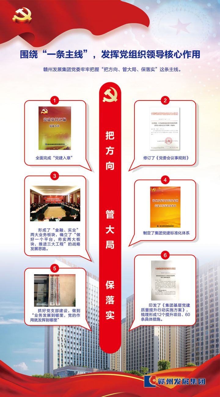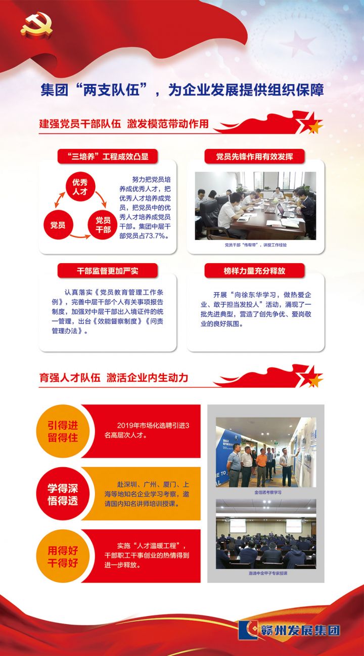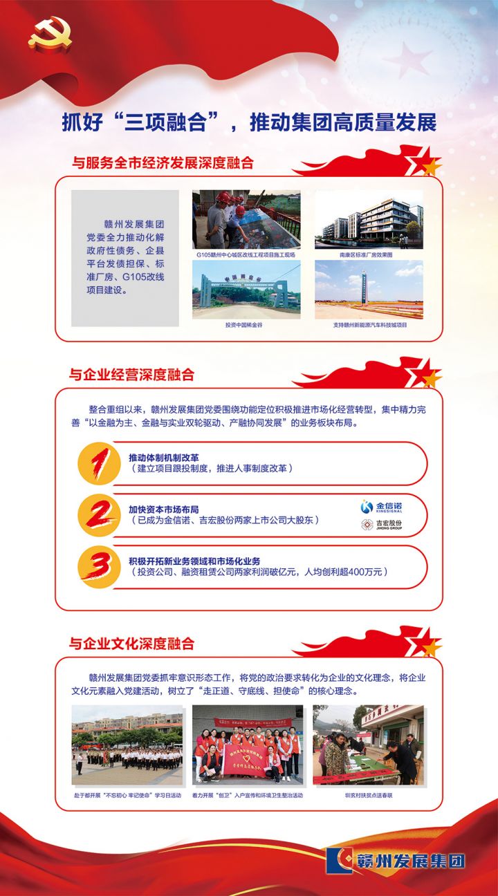 整合重组以来,集团党委认真贯彻落实《中共赣州市委关于开展基层党建质量提升行动的实施意见》、市国资系统基层党建质量提升工作推进会精神,坚持“企业党建做实了就是生产力、做强了就是竞争力、做细了就是凝聚力”这一党建工作理念,充分发挥党委政治核心作用,紧扣工作实际,创新“123”党建工作法,引领企业高质量发展取得新成效。