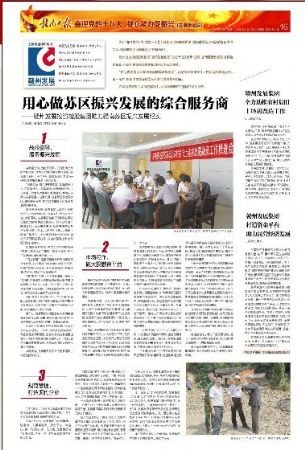 主题报道以《用心做苏区振兴发展的综合服务商》为题,由三部分组成。第一部分主要从战略层面入手,阐述了我公司立志做赣南苏区振兴发展综合服务商的初衷、方向和路径。第二部分从市场运作的角度,描述了我公司勇挑重担,为民生不辱使命的历程,表明了我公司用心做赣南苏区振兴发展综合服务商的坚强意志。第三部分主要从以打造现代型企业为目标,加强企业自身管理和建设的角度,阐述了公司的核心价值观,客观描述了我公司法人治理、企业文化和承担社会责任的作为和成效。
