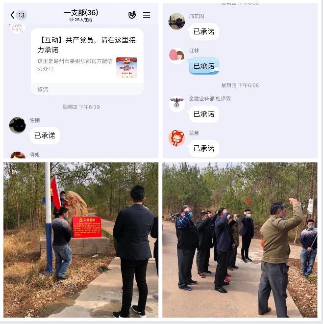 承诺如山,使命必达。集团党委积极开展“防范疫情、从我做起”承诺活动,各党支部纷纷响应,组织121名在职党员进行承诺,践行承诺。机关党支部在疫情防控工作中,坚持“三服务”承诺,积极作为,充分应用OA办公系统、微信群和QQ群,实施网络办公,搭建起跨越疫情阻隔的沟通桥梁,及时对上级疫情防控工作进行传达部署;成立志愿服务队,为员工采购疫情防控物资,为保证人员不聚集,志愿服务者宁愿牺牲自己休息时间,安排员工错峰领取,切实践行着全心全意为人民服务的宗旨。一名党员一面旗。2月2日,南康区唐江镇中田村红米小组党旗飘扬,村委会组织党员在村民小组村口举行了一场感人的宣誓活动,我集团机关党支部梁煌同志铿锵有力的声音在这片土地上回响:我自愿加入中国共产党……共产党员、召之即来、来之能战、战则必胜……。在南康区唐江镇中田村疫情防控工作中,他积极加入当地疫情防控阻击战,大力开展政策宣讲,协助镇、村党组织做好疫情防控宣传,协助村里排查出入人员,以忘我的精神,切实做到了只要有任务,党员不缺位。连日来,胥伟莉同志作为疫情防控协调联络人,带病加班加点,坚持在疫情防控“幕后”,全力做好上传下达、综合协调工作,草拟文件、汇总表格,认真做好疫情信息研判工作。2月3日,胡华平同志发挥党员带头作用,不怕脏不怕累,在城岗乡白石村主动协助保洁员开展环境卫生整治,清理卫生死角3处,清理垃圾2车,村圩环境卫生焕然一新。