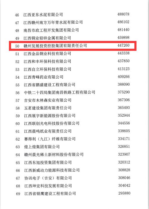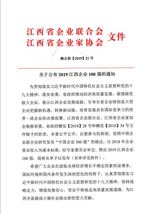 日前,江西省企业联合会、江西省企业家协会发布了“江西企业100强”榜单,集团荣列2019江西企业100强榜单第50位。