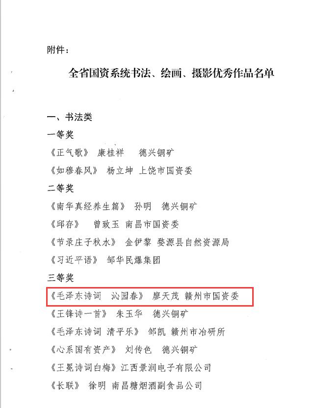 近日,江西省国资委公布了《关于全省国资系统书法、绘画、摄影优秀作品评选结果的通知》,集团选送的书法作品——《毛泽东诗词 沁园春》(作者:廖天茂)荣获书法类“三等奖”。