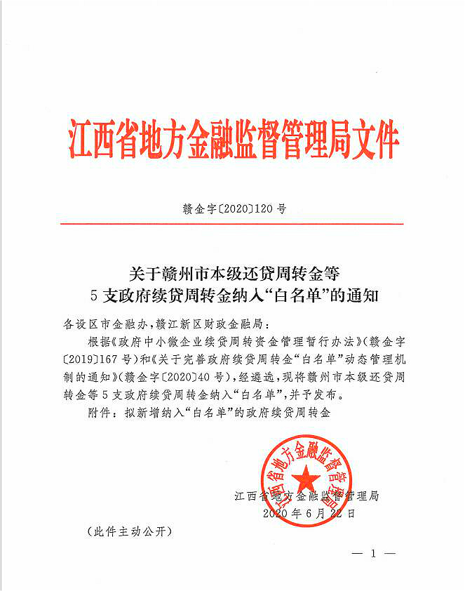 近日,江西省地方金融监督管理局下发《关于赣州市本级还贷周转金等5支政府续贷周转金纳入“白名单”的通知》,同意赣州发展企业还贷周转金公司纳入政府续贷周转金“白名单”。