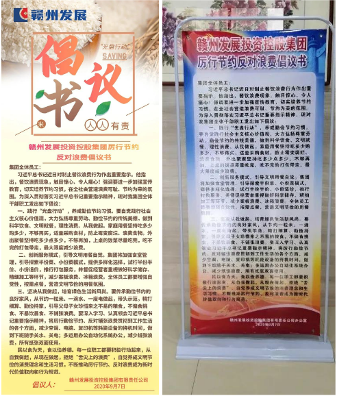 发放倡议书。向集团全体员工发出“文明用餐、反对浪费”倡议书,倡议广大员工社会聚餐吃多少点多少,家庭用餐吃多少购多少,切实发挥党员先锋引领和带头示范作用,在制止餐饮浪费、引领发投文明新风尚中起到表率,创建节约型集团,为建设文明发投贡献自身的力量。