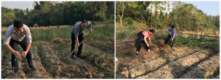 李贱贵与扶贫干部来到田坎地头和贫困户一起劳动,挖红薯、挑水浇菜,他说,自己也是农家子弟,以前也经常干农活,说着就轮起锄头,说干就干,边干农活边跟乡、村干部讨论村里产业发展事宜。