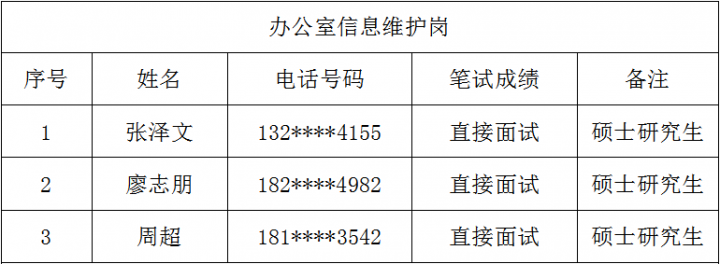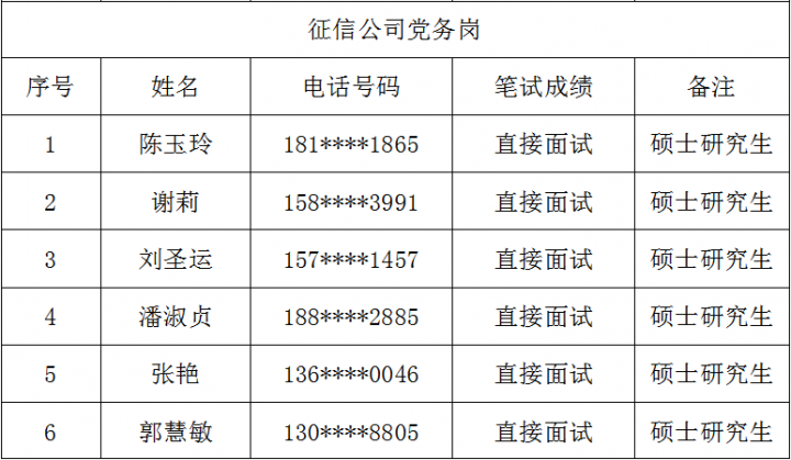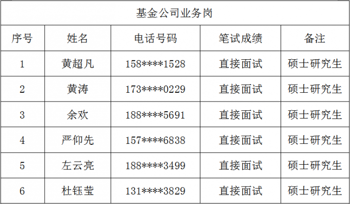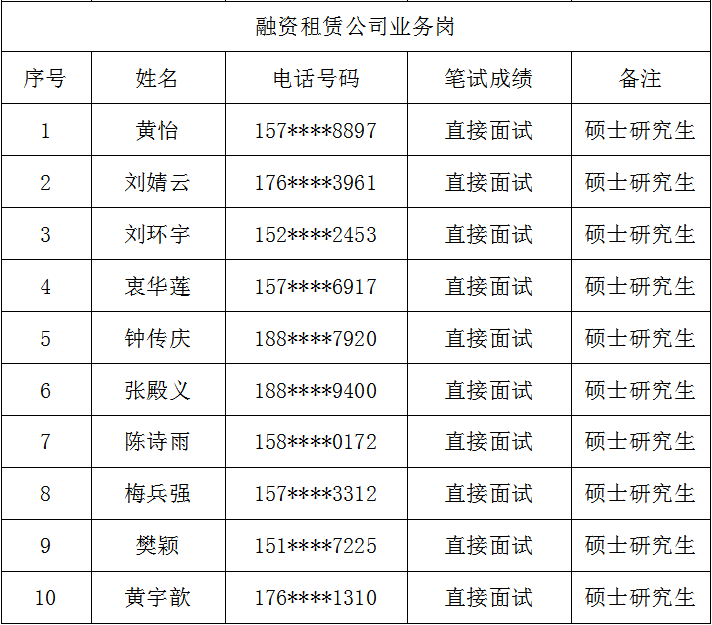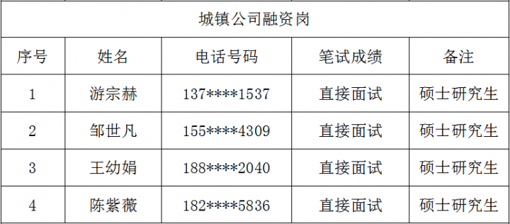 根据《赣州发展投资控股集团应届毕业生招聘公告》规定的程序,经简历初审、资格审查、笔试环节,根据《招聘公告》,笔试成绩合格线为60分,未达到60分的,不可进入面试;硕士研究生免笔试,直接进入面试。现将参加面试人员名单公告如下:(同时公布面试有关事项):