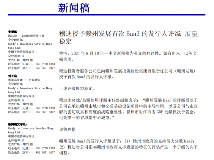 8月10日,赣州发展投资控股集团荣获全球三大权威信用评级机构之一——穆迪投资者服务公司正式授予的Baa3(投资级)国际信用等级,评级展望为稳定,成为江西省首家、中部六省第3家获得穆迪投资级国际信用等级的地市级国企。