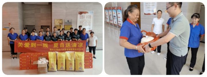 物业保安坚持站岗值班、巡逻检查,维护着大厦的秩序。保洁人员奋战在一线,他们每天清晨就开始劳作,打扫地面、擦拭公共设施等。他们经受了高温的“烤”验,默默地坚守岗位,把汗水留给自己,把整洁的环境留给大家。资产公司工作人员向总部经济区物管人员送上了绿豆、王老吉等清凉物资。