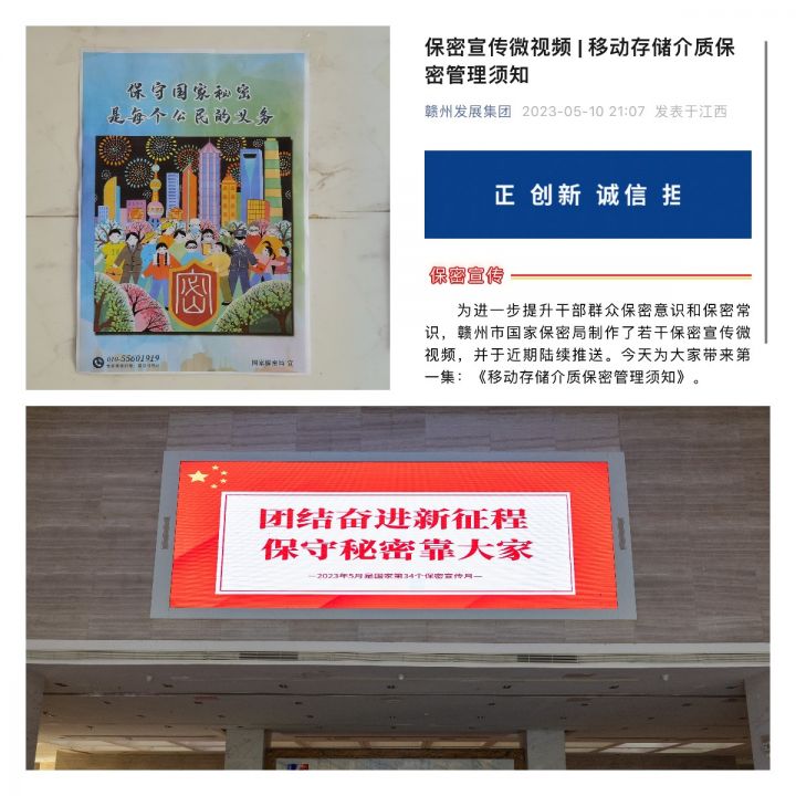 加大保密工作的宣传力度,在集团一楼大厅张贴保密公益宣传海报——《中国结》《保密春风进万家》;在办公楼公共区域的显示屏上,循环播放保密公益宣传片及标语;通过微信公众号、门户网站,转发保密公益宣传片和宣传海报等相关保密知识,通过广泛宣传,让保密理念深入人心,让保守国家秘密成为每一个干部职工的自觉行动,做到“守口如瓶、防意如城”。