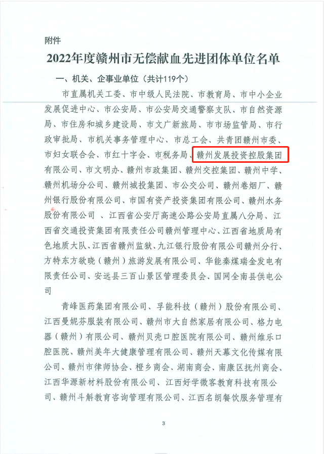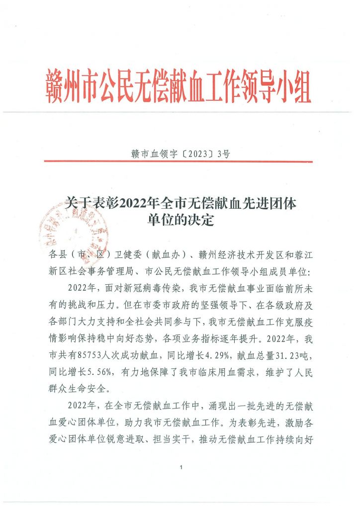 6月6日,赣州市公民无偿献血工作领导小组印发《关于表彰2022年全市无偿献血先进团体单位的决定》(赣市血领字[2023]3号),必赢3003no1线路检测中心被评为“2022 年度赣州市无偿献血先进团体单位”。