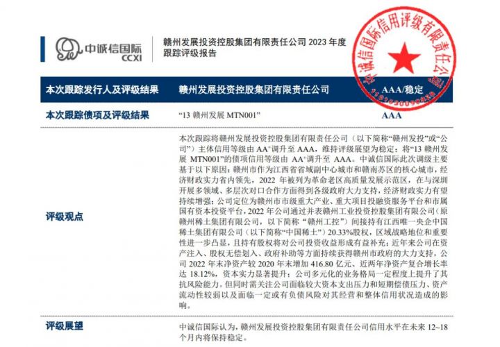 重磅!赣州发展投资控股集团喜获中诚信AAA主体信用评级