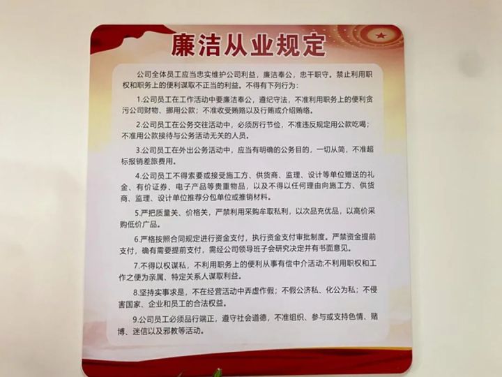 严格落实各项责任。支部严格落实党风廉政建设主体责任和监督责任,支委会至少每半年专题研究1次党风廉政建设和反腐败斗争工作,与全体党员、员工签订了党风廉政建设责任书,对党风廉政建设工作实行层级管理,做到一级抓一级,层层抓落实。注重廉政学习宣传。通过支委会、员工大会、党员大会等深入学习党的二十大精神、党章、法律法规及党风廉政建设新要求,筑牢广大党员员工思想防线。集中购置了党纪、法律法规、廉政文化读本等书籍,建设了“廉洁书屋”,同时在公司办公场所走廊设置了廉政文化宣传栏,丰富了廉洁文化阵地,营造了“学廉、尊廉、崇廉、爱廉”浓厚氛围。持续开展警示教育。支部常态化开展违法违纪案例通报,每季度开展专题警示教育1次、廉政谈话1次、讲授党风廉政建设专题党课1次,每逢节假日提前向党员员工发送廉洁提醒,定期开展廉政家访,将党风廉政建设和反腐败要求传导到每一名干部、党员,引导广大党员干部提高拒腐防变的能力。