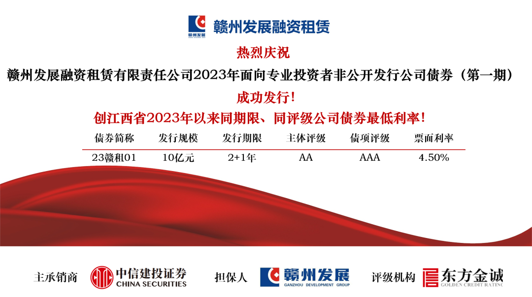 10月23日,赣州发展融资租赁有限责任公司成功发行2023年度第一期非公开发行公司债券,发行规模10亿元,发行期限2+1年,票面利率为年化4.50%,本期债券利率创江西省2023年以来同期限、同评级主体公司债券最低水平,充分展现了市场投资者对租赁公司的高度认可。
