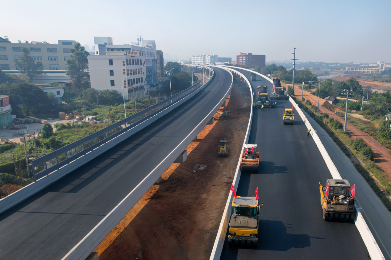 赣南大道快速路Ⅳ标(龙岭西路至创胜路东侧段)项目沥青摊铺全长约5.68km,总铺设面积约13.3万平方米。截止目前,已累计完成总工程量的77%,主线桥梁工程完成100%。下一步,项目将重点推进伸缩缝、声屏障、桥面照明、交通设施等桥面系及桥面附属施工,为实现2023年底项目主线高架桥通车目标全力冲刺。