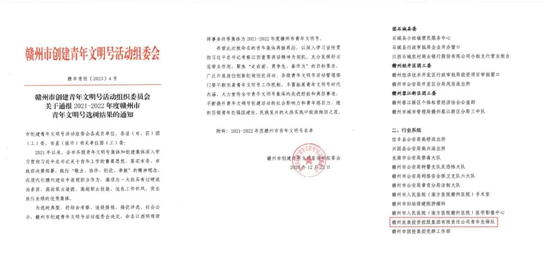 近日,赣州市创建青年文明号活动组委会印发《关于通报2021-2022年度赣州市青年文明号选树结果的通知》,集团青年先锋队获评2021-2022年度“赣州市青年文明号”荣誉称号。