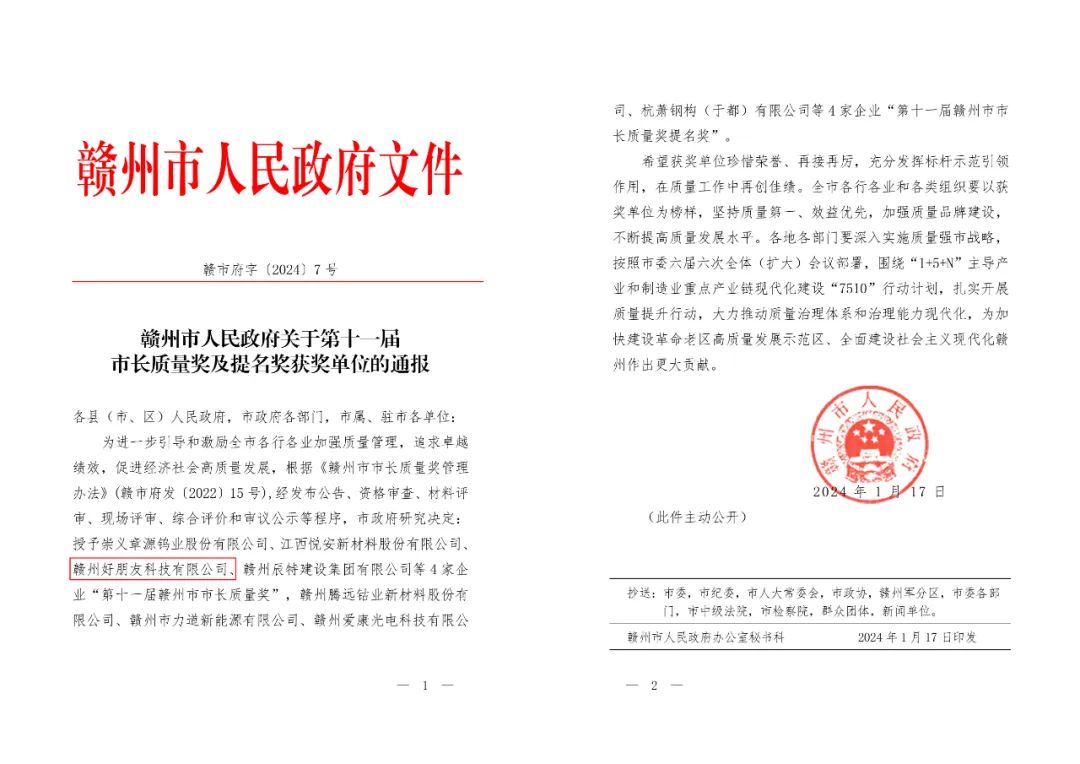 近日,必赢3003no1线路检测中心旗下全资子公司赣州发展投资基金管理有限公司投资企业赣州好朋友科技有限公司(以下简称“好朋友科技”)荣获“第十一届赣州市市长质量奖”。