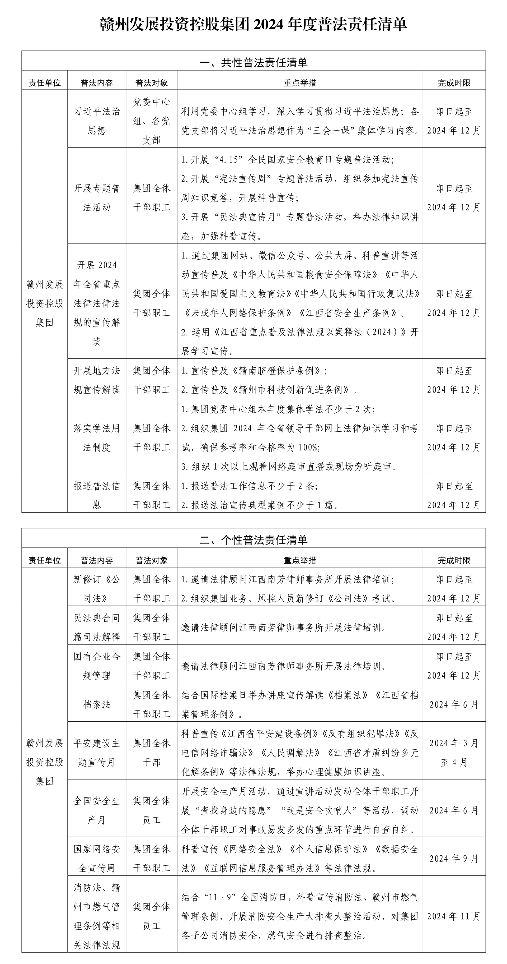 赣州发展投资控股集团2024年度普法责任清单