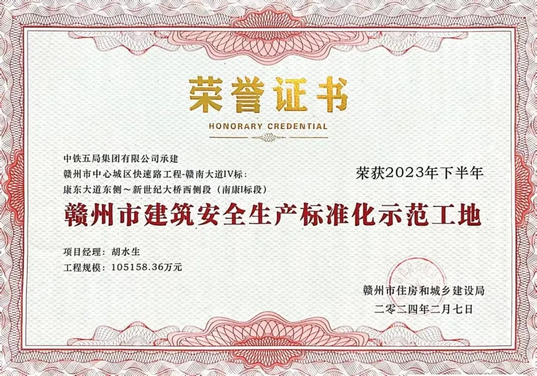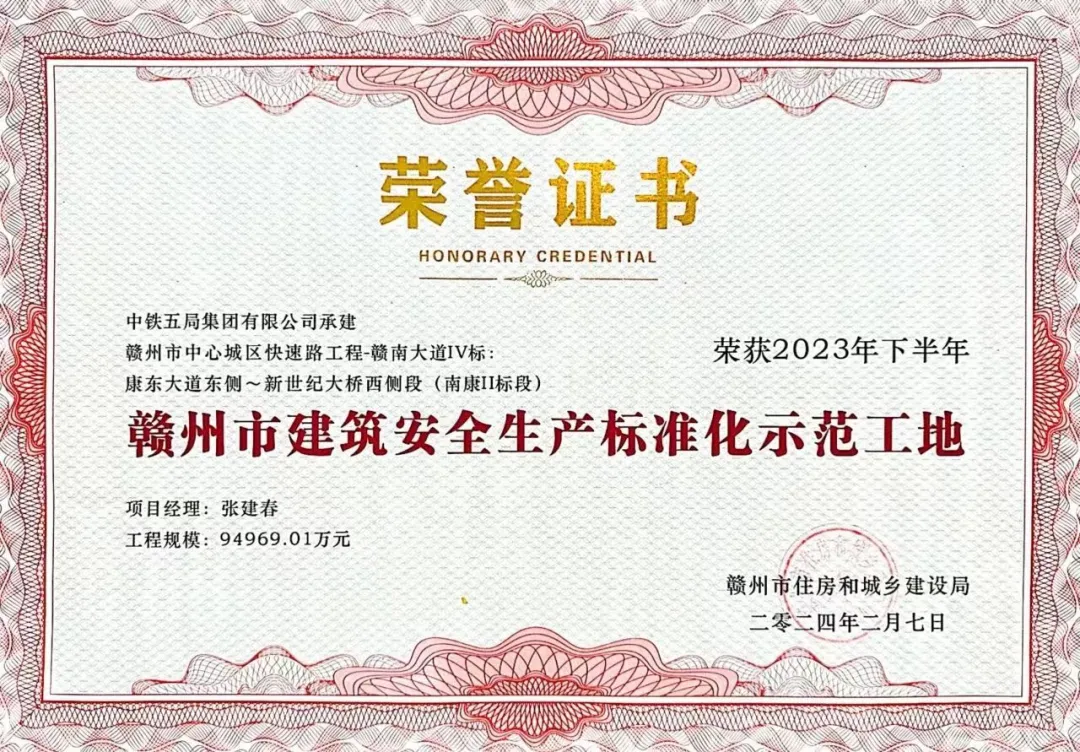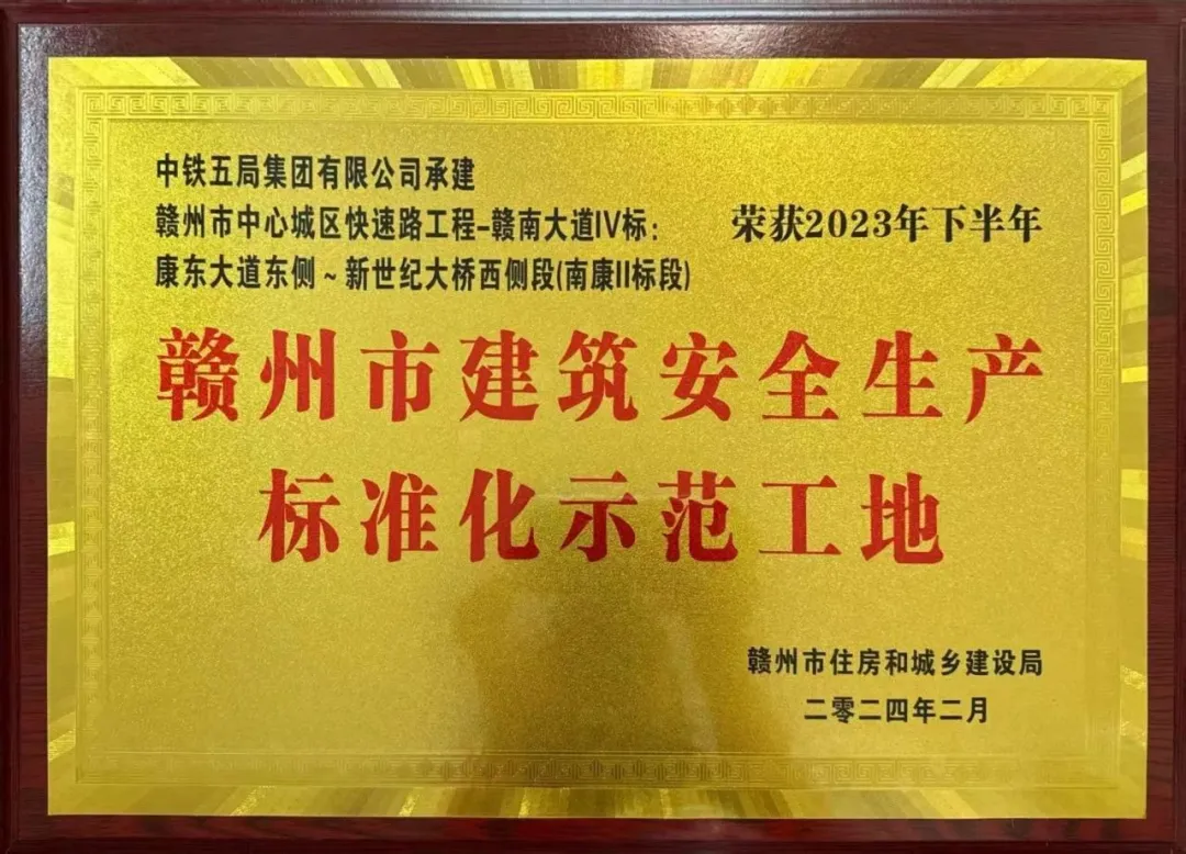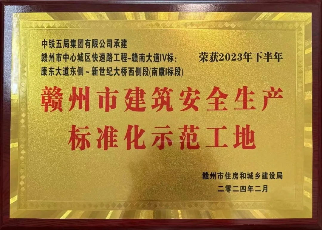 近日,从有关部门传来喜讯,赣南大道快速路四标南康段项目荣获赣州市住房和城乡建设局“2023年下半年赣州市建筑安全生产标准化示范工地”荣誉称号。