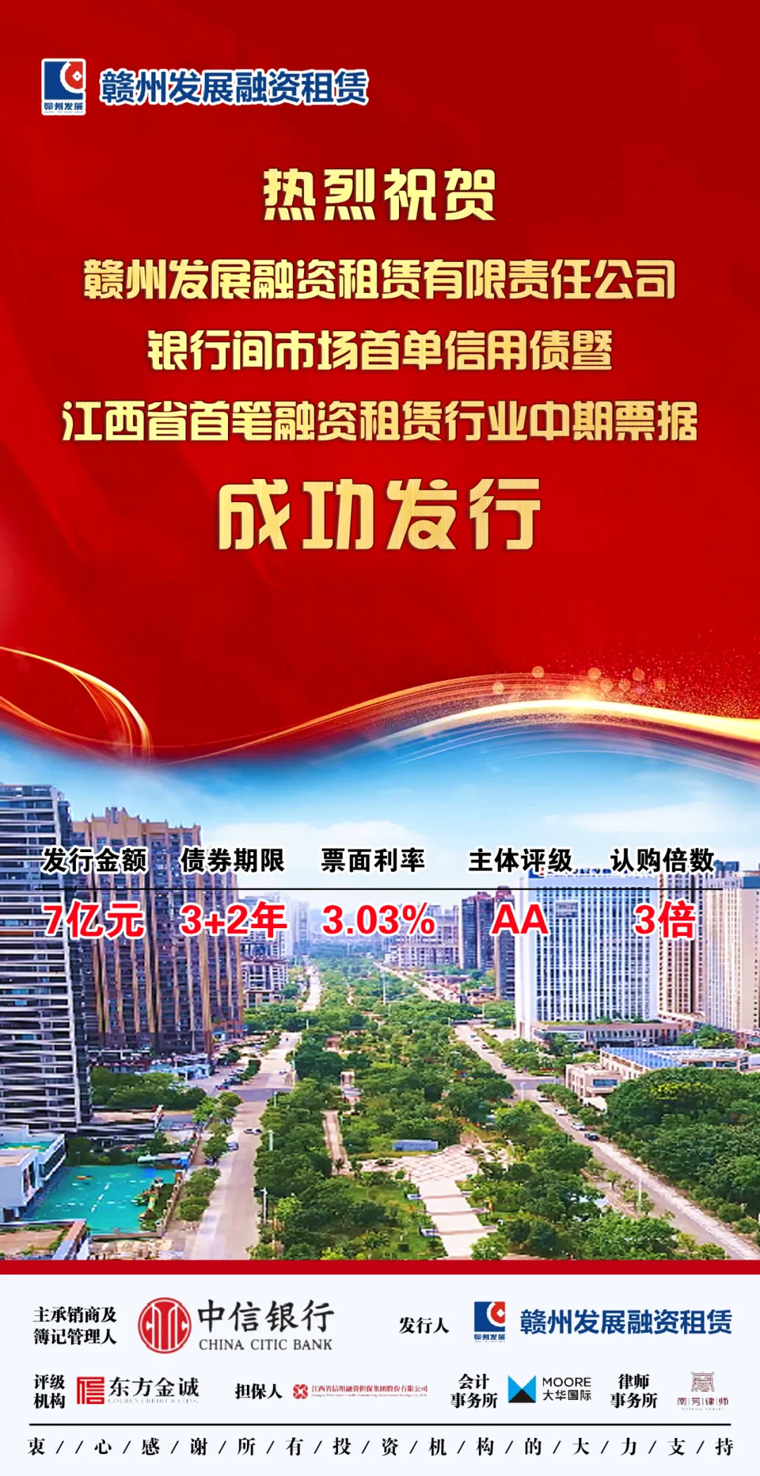 5月8日,赣州发展融资租赁有限责任公司(以下简称“赣发租赁公司”)成功发行2024年度第一期中期票据,发行总额为7亿元,票面利率3.03%,为江西省内融资租赁行业首单中期票据,实现了零突破,同时刷新了该公司发行债券最低票面利率记录。