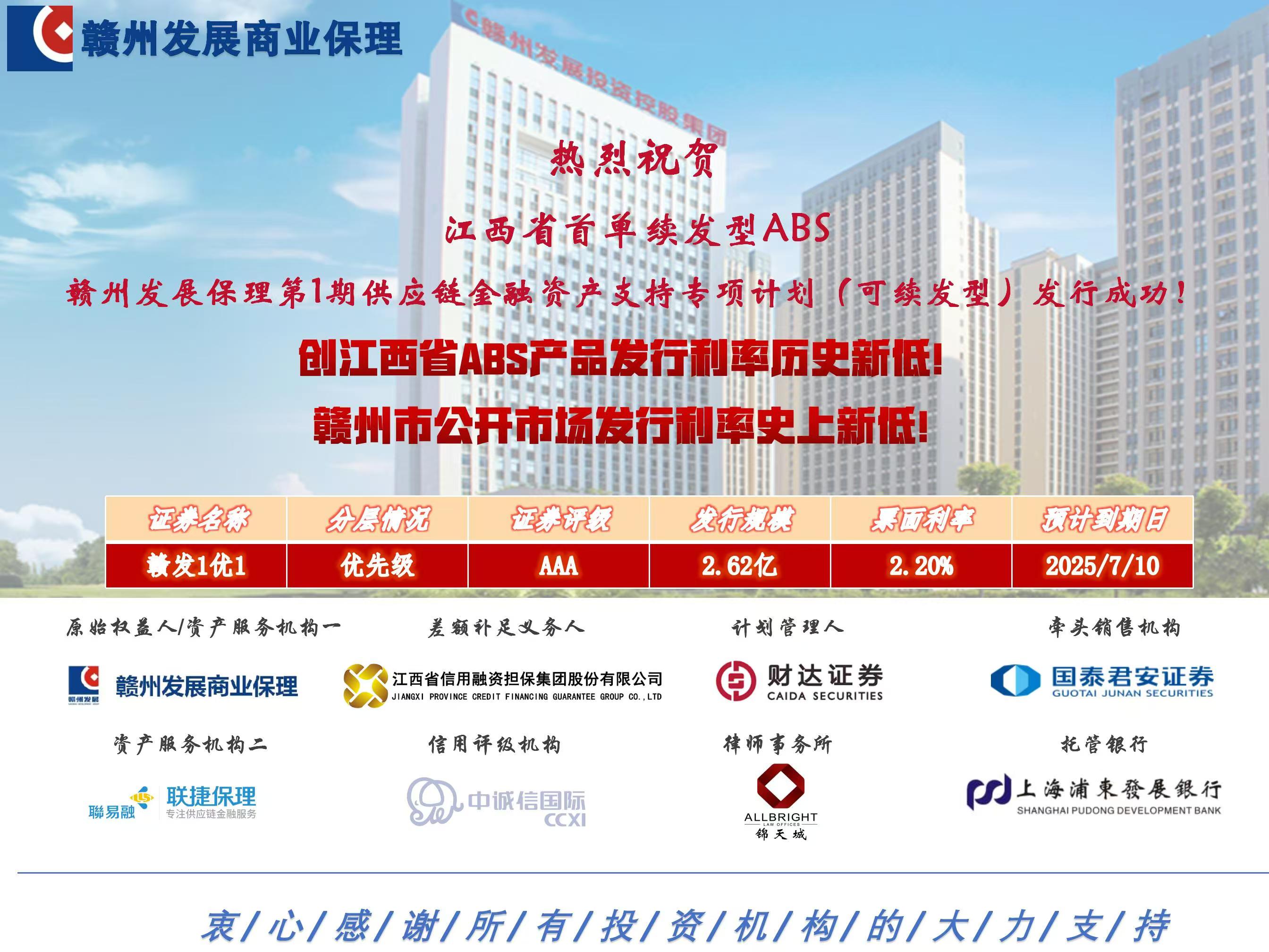 8月5日,必赢3003no1线路检测中心旗下保理公司“赣州发展保理第1期供应链金融资产支持专项计划(可续发型)”成功簿记!簿记发行规模2.63亿元,期限1年,其中优先级规模2.62亿元,评级AAAsf,票面利率2.2%。8月9日募资全部到位。本产品系江西省首单续发型ABS,发行利率创江西省ABS产品发行利率历史新低,创赣州市公开市场发行利率史上新低。
