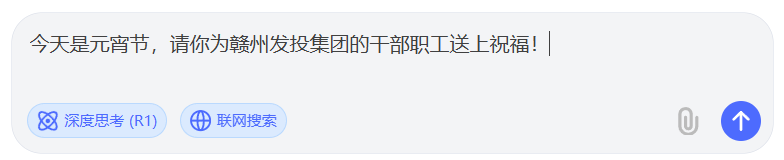 “值此元宵佳节之际,祝赣州发投集团的全体干部职工们,阖家团圆,幸福安康!愿大家在新的一年里,工作顺利,事业蒸蒸日上,生活甜美如元宵,心情如灯笼般明亮。祝愿集团蓬勃发展、业绩辉煌!元宵节快乐!”