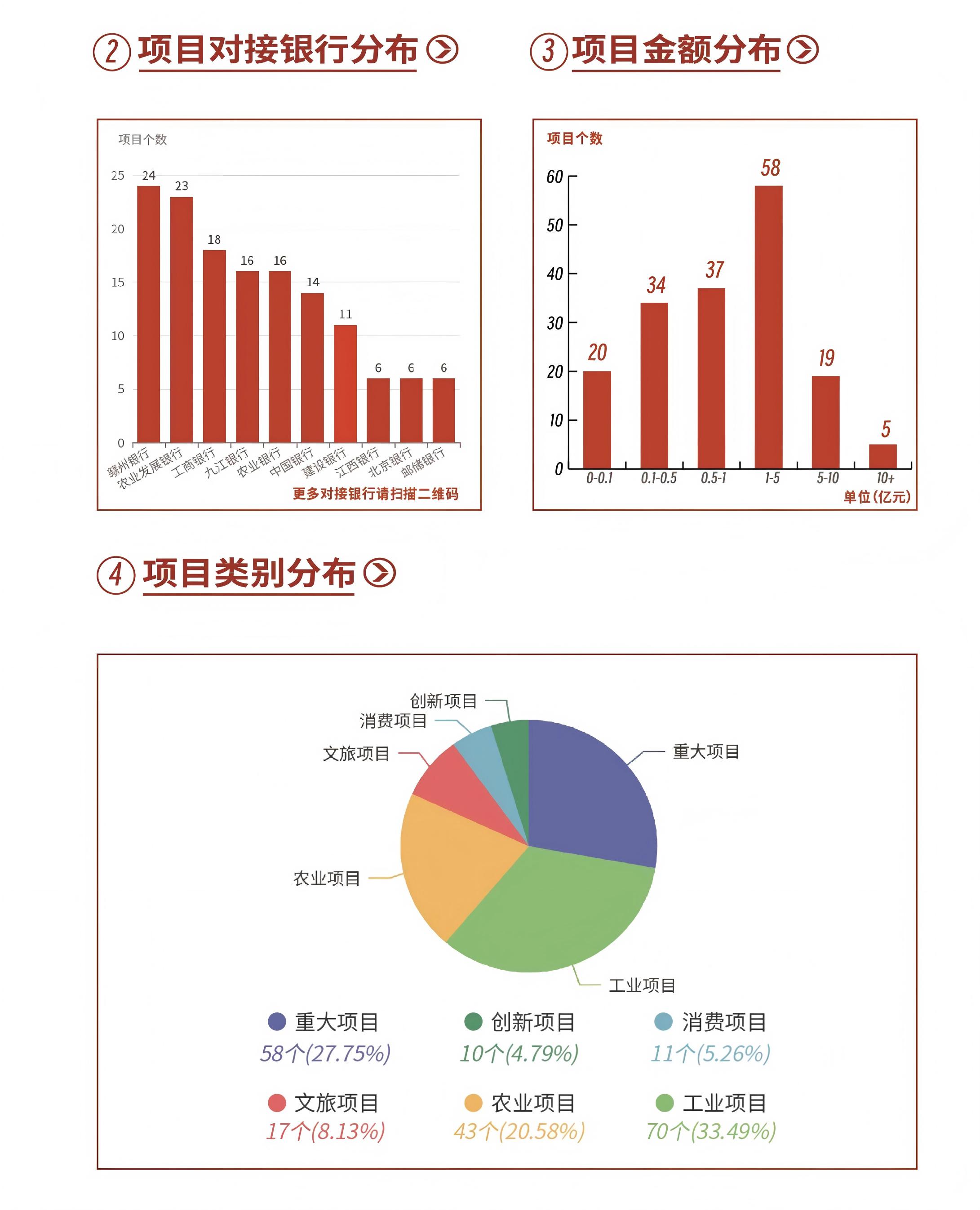 集成动态数据统计与可视化展示模块,用户扫码即可实时查看全市261个项目的融资需求、区域分布、项目分布、金额分布及银行分布等总体情况,打破信息孤岛,实现数字“跃然‘码’上”。截止目前,系统共收集项目261个,总融资需求559亿元,其中,已签约项目162个,签约金额388亿元。项目覆盖6大行业,纳入省市大中型项目共71个。