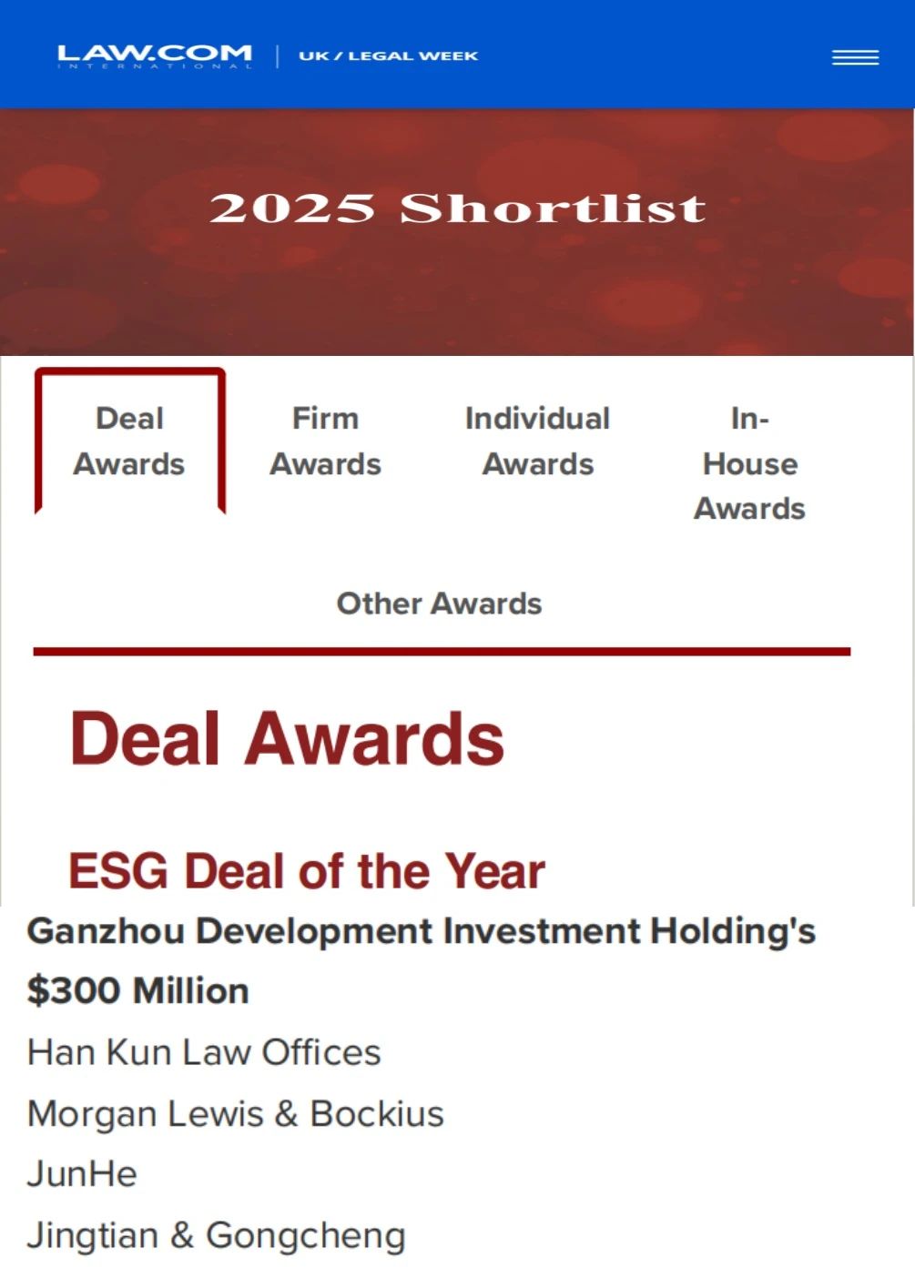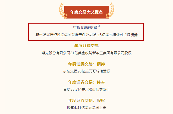 近日,国际知名法律媒体Law.com International公布2025年度亚洲法律大奖提名名单,赣州发展投资控股集团有限责任公司3亿美元可持续发展境外债券项目强势入围“年度交易大奖”子奖项“年度ESG交易”奖项提名,成为境内唯一获得该奖项提名的企业,以“可持续发展”鲜明属性,彰显集团在ESG实践与国际资本运作中的双重突破。