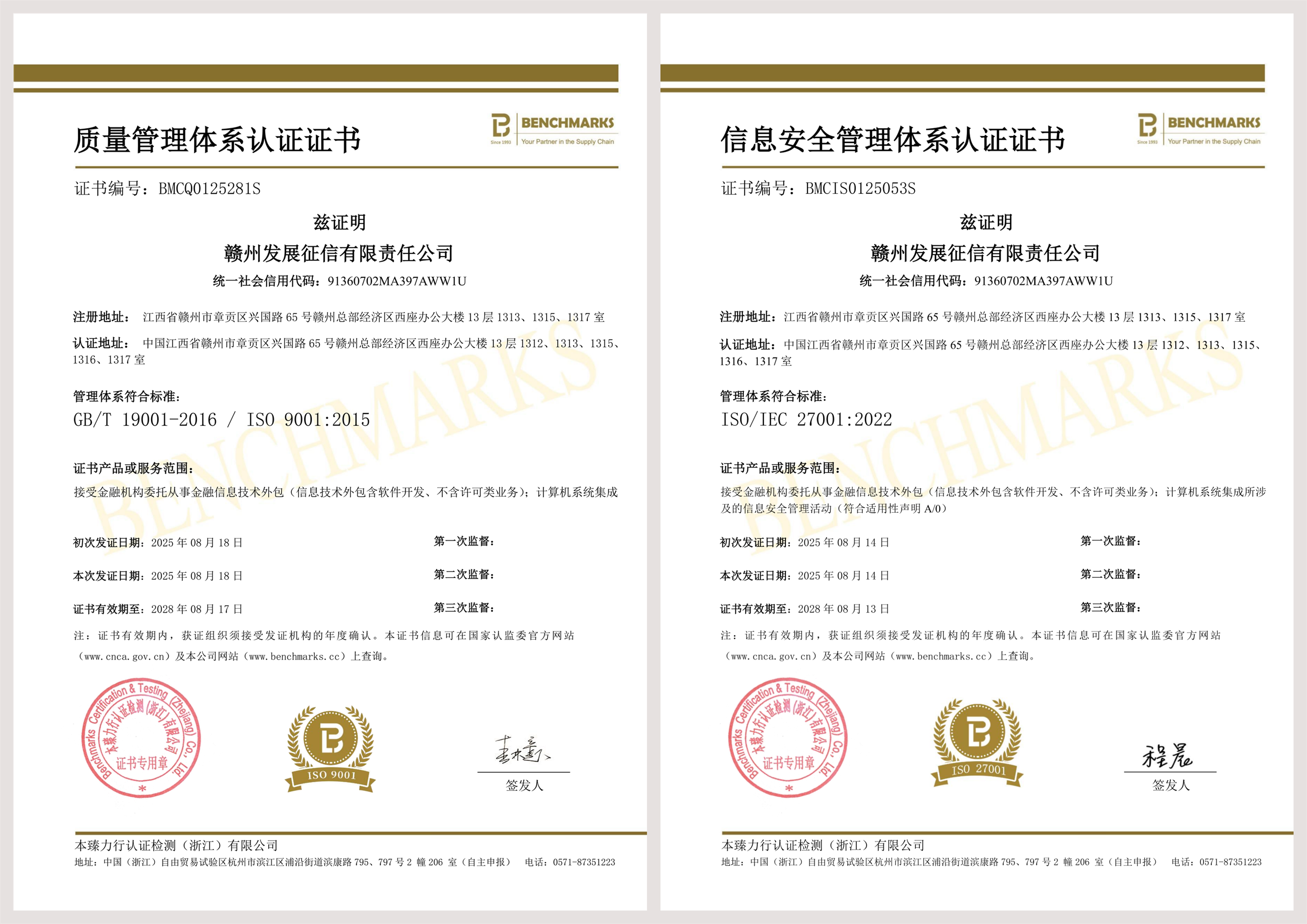 赣州发展征信公司荣获ISO9001与ISO27001双体系认证