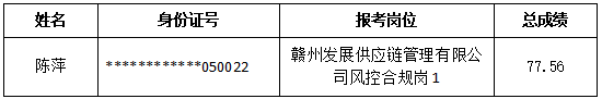 根据《赣州发展投资控股集团有限责任公司2025年公开招聘公告》相关规定,因赣州发展供应链管理有限公司风控合规岗1江南个人自愿放弃体检、背景调查资格,按总成绩从高分到低分顺延递补。现将递补入围体检、背景调查人员名单及有关事项公告如下: