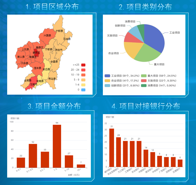 产融对接创新突破。在2025年第十一届江西省金融机构支持赣州市经济高质量发展产融对接活动中,首次通过数字科技为金融服务赋能,实现了产融对接项目数字可视化,为大会的顺利召开提供了坚实的技术支撑与保障。集成动态数据统计与可视化展示模块,实现261个项目、559亿元融资需求的线上实时查看;其中已签约项目162个,签约金额388亿元,推荐项目完成授信8.316亿元,展现了国企在促进产融结合中的枢纽作用。