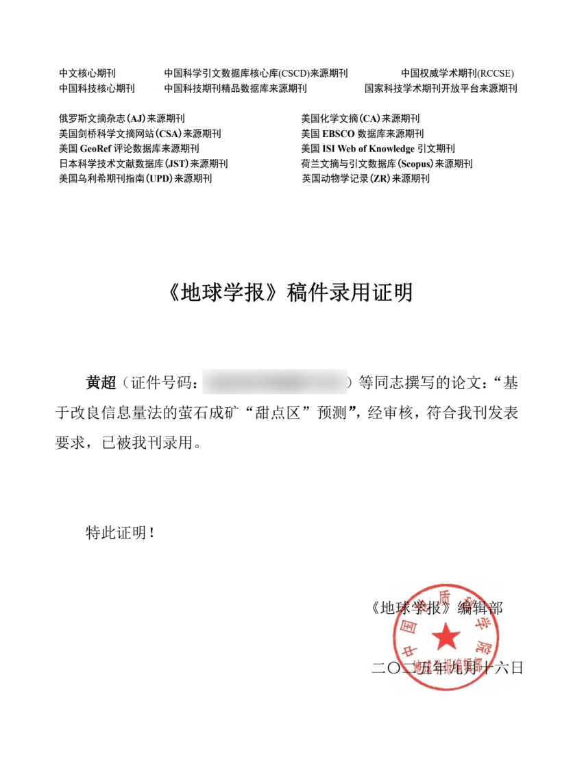 近日,赣州工控集团黄超、杨相、蓝升等同志撰写的《基于改良信息量法的萤石成矿“甜点区”预测》论文,被中国地质科学院主办的中国科技核心期刊、全国中文核心期刊《地球学报》杂志录用。