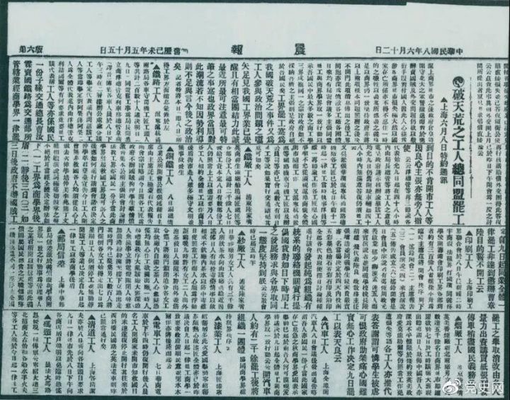 1919年6月3日以后,上海工人率先罢工,使五四爱国运动进入新的阶段。图为北京《晨报》关于上海六、七万工人总同盟罢工的报道。