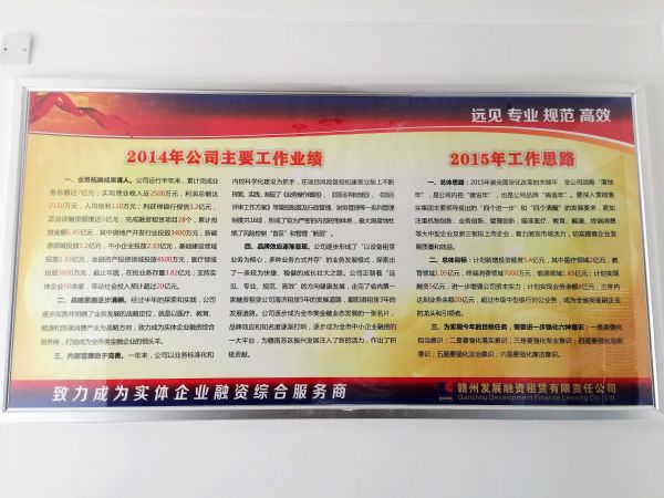 2015年,融资租赁公司积极加强企业宣传文化建设,秉承“远见、专业、规范、高效”的经营理念,在公司设置企业文化宣传栏,各办公室粘贴各部门岗位职责、日常工作制度、学习制度等。企业文化建设的不断加强,不仅对提升企业形象、树立企业品牌起到积极作用,更让公司全体员工能明确自身岗位职责较好地完成工作,激励了员工奋发向上的群体意识,并引导大家树立正确的工作态度,营造了良好的工作氛围。
