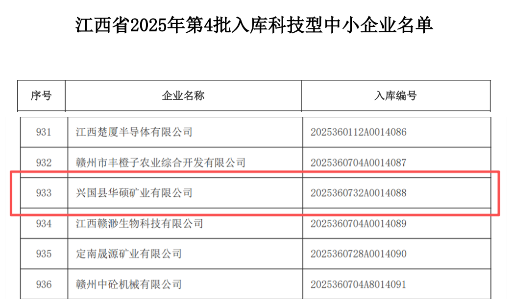 喜讯!兴国华硕矿业获评国家科技型中小企业