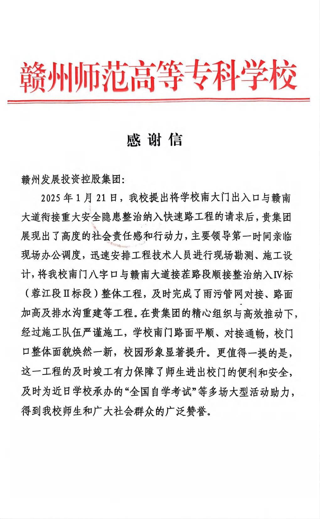 “初心不忘来时路,真情协助显担当。贵集团与我校心手相连,千方百计解我们之所难,全力以赴为我校师生办实事、办好事,不遗余力为我校建设事业添砖加瓦。”赣州师范高等专科学校发来的感谢信,字里行间满是真挚的感激。此前,该校门口因快速路施工出现地面高差,给师生出行带来安全隐患。了解到该情况后,集团领导多次深入一线调度,为彻底消除隐患,把衔接改造纳入赣南大道相关标段建设,有序推进雨污管网顺接、路面加高、排水沟重建等工作,成功解决了师生的出行难题,保障每日8000余名师生安全出行,让“堵心路”彻底变成了“安心道”。