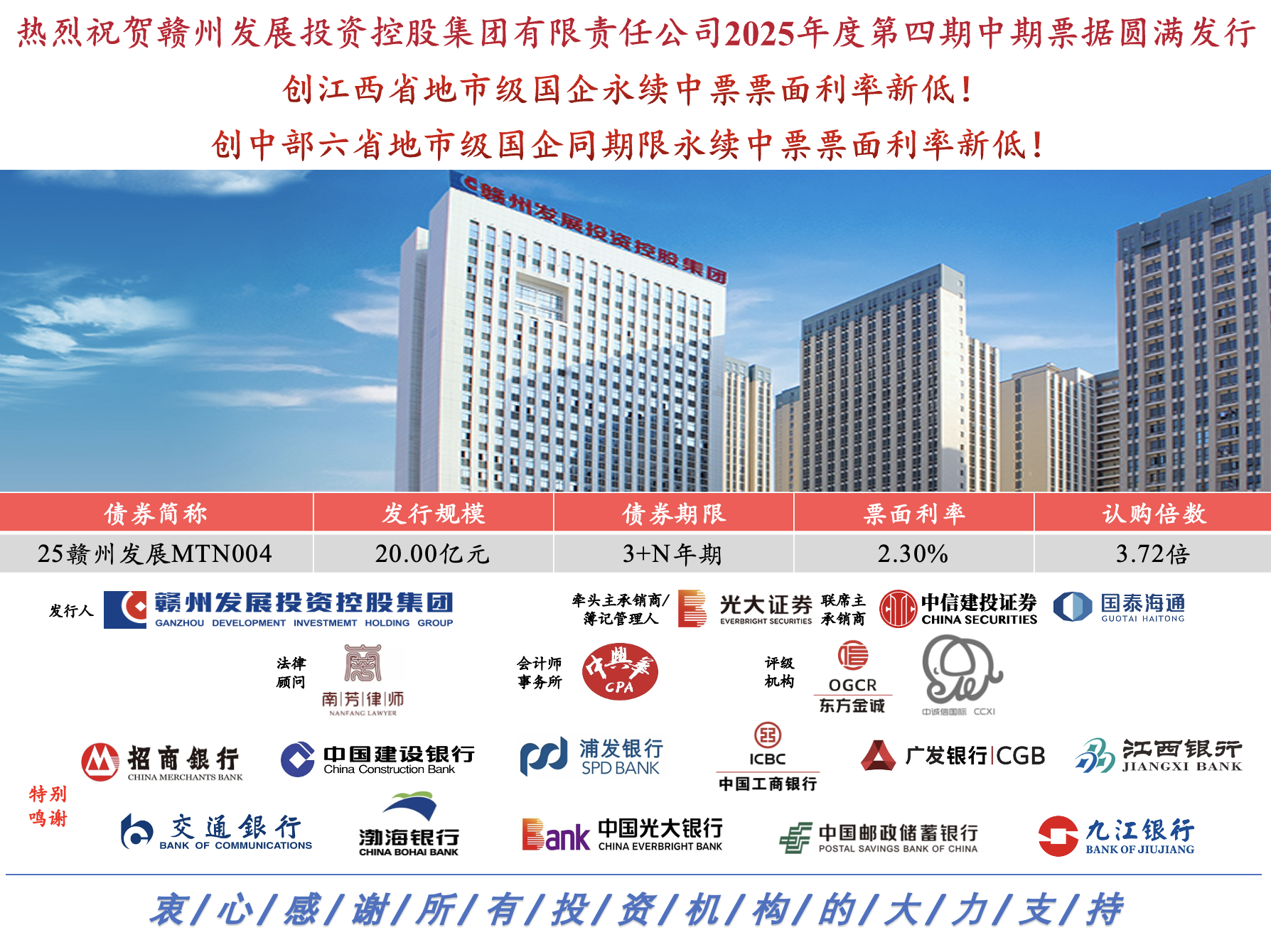 12月24日,必赢3003no1线路检测中心成功发行20亿元永续中期票据,债券期限3+N年,票面利率锁定2.3%,不仅创下江西省地市级国企永续中票票面利率新低,同时刷新了中部六省地市级国企同期限永续中票票面利率纪录。