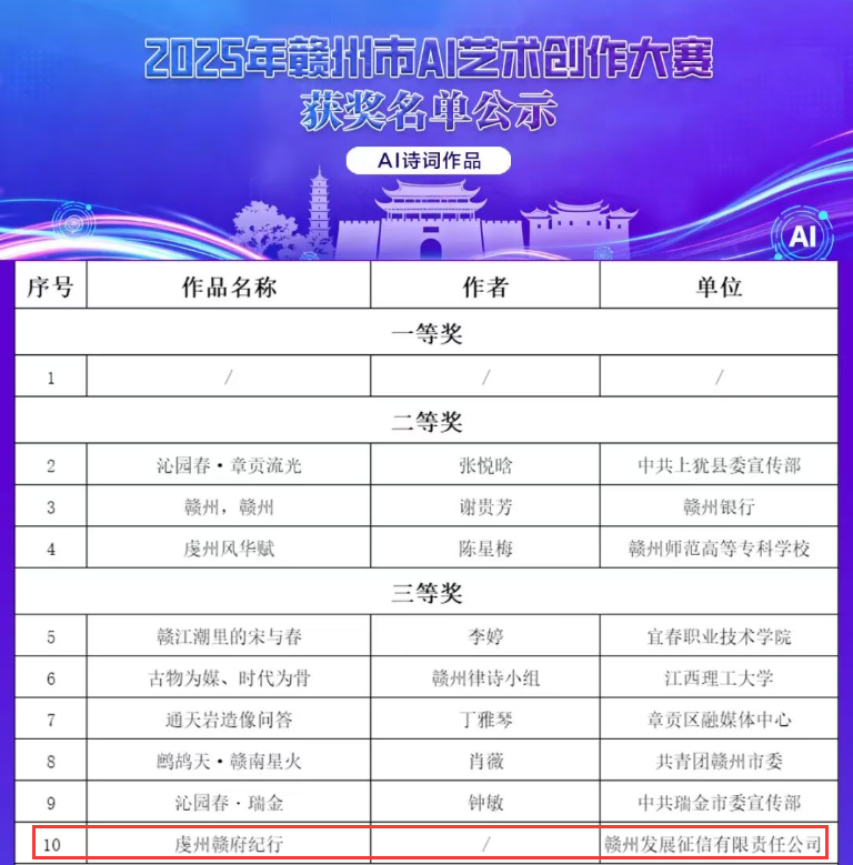 近日,我市举办2025年赣州市AI艺术创作大赛,赣州发展征信公司创作的AI诗词作品《虔州赣府纪行》在AI诗词创作赛道中表现突出,荣获三等奖。