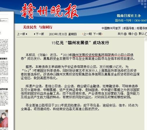 市级媒体报道我公司成功发行15亿元“13赣州发展债”